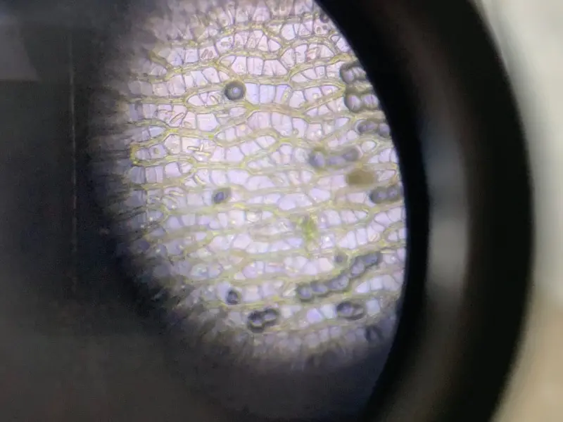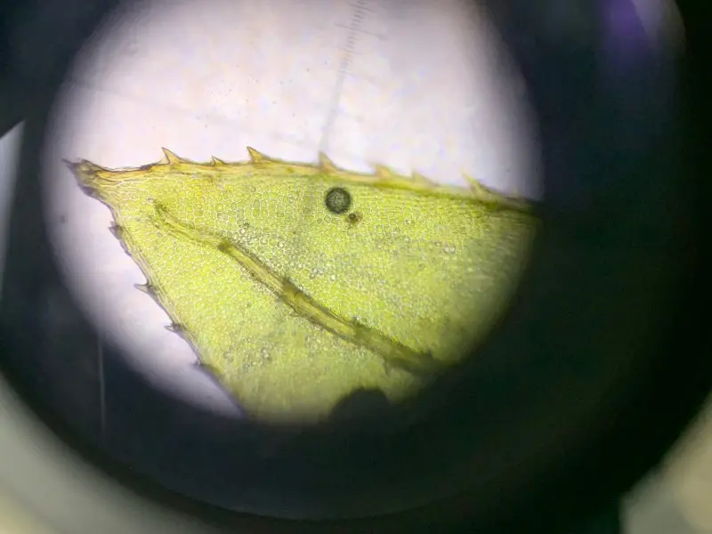 I was blown away by the linkage between the characteristics of the plant in the field and it under the microscope. I have long been a not-so-secret admirer of two of the Plock’s most common mosses: the beautiful glittering wood moss, Hylocomium splendens and a similar species, Thuidium tamarascum. Together they carpet the woodland of the Plock in bright yellow and green, but we learnt something new from looking at them through the microscope: H. splendens shone under the microscope with light reflected by its elongated cells. These bounce the light off the moss, creating the magical, glittering effect it’s known for, while T. tamarascum has circular cells which create a matt effect on the moss, deadening the light and generating an altogether different appearance when seen en masse.