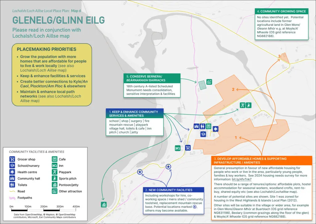 which was produced with extensive community engagement in 2021. The Local Place Plan shows how local communities would like the priorities in the Community Action Plan to be implemented on the ground across Lochalsh, through a series of maps such as the Glenelg example shown below. This is explained in more detail in the